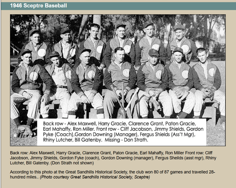 After almost a month, the results came in, and they were photos of the Sceptre teams in 1950 and 1951. Jay-Dell Mah has copies of these from the Sandhills Museum on his website attheplate.com: