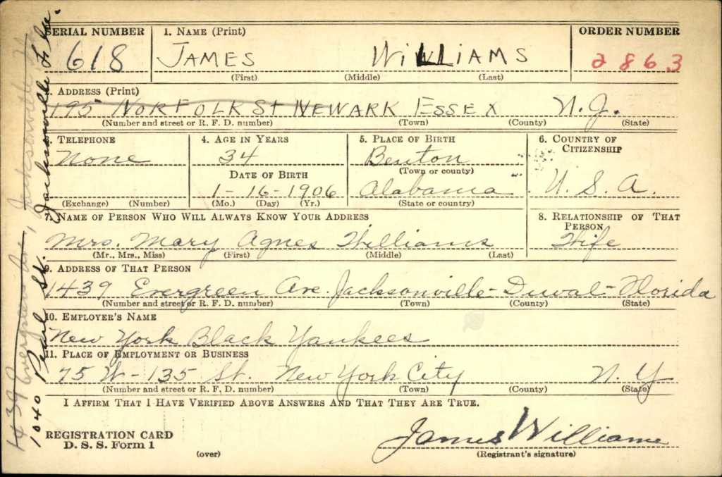 Williams also registered for the military draft in 1940, but his name was never drawn in the lottery process, and he never served in WW2. The record shows he was married, and before the season was over, the draft card indicates he shifted from the Crawfords to the New York Black Yankees. The 34-year-old right-fielder stats by Riley indicate that he ended his season with “uncharacteristically low averages of .200 and .245”