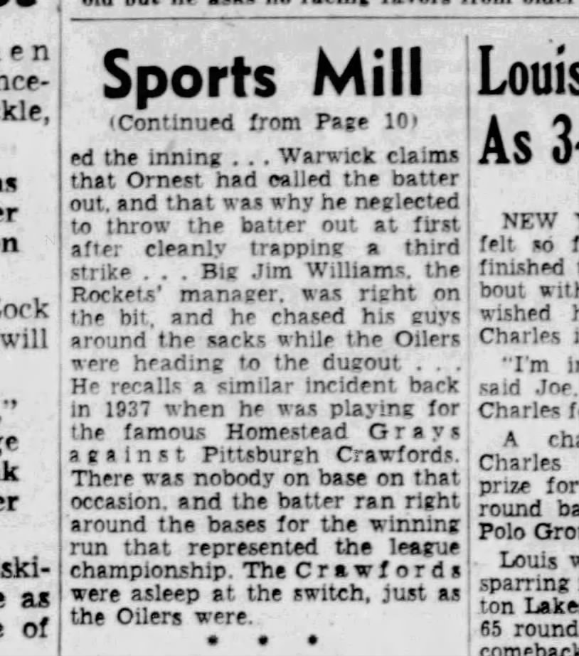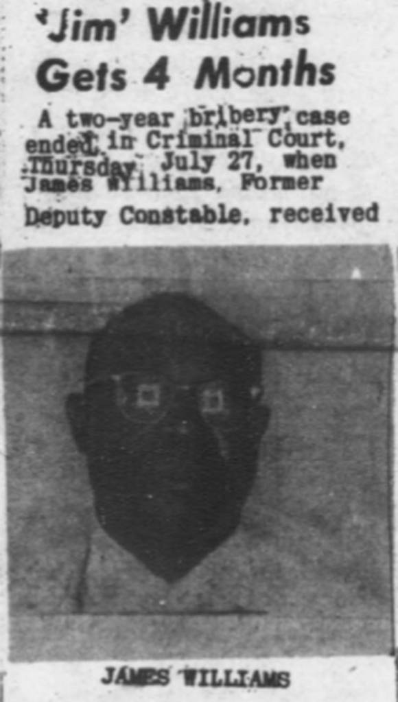 “A two-year bribery case ended in criminal court on Thursday, July 27th, when James Williams, former deputy constable, received a four-month term in county jail on a misdemeanor charge of bribery. Williams, 49 [He was actually 55], a former outfielder with the New York [Black] Yankees, reportedly was involved in the shakedown of a burglary suspect, Freddie Patton, when he was apprehended.