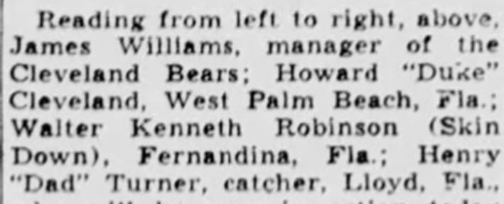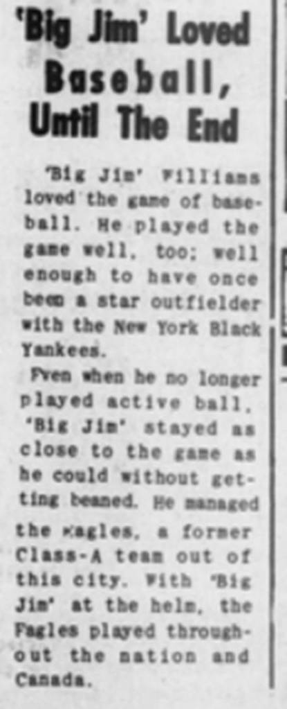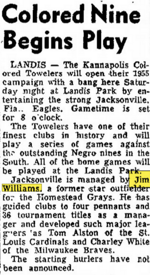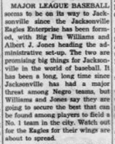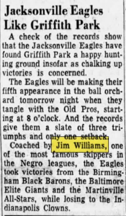 Williams headed back to Florida to coach for the Jacksonville Eagles. With Big Jim at the helm, newspapers praise his victories over teams such as the Birmingham Black Barons, the Baltimore Elite Giants, and the Martinville All-Stars.