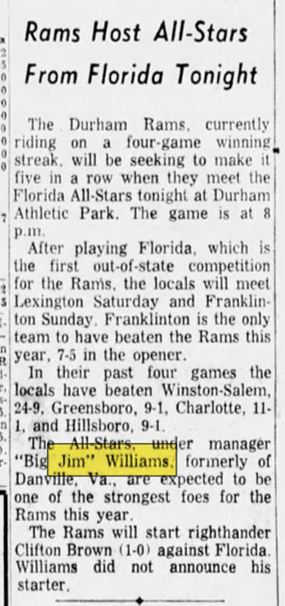 In 1956, Williams moved to the Florida All-Stars and referenced a former team (Danville All-Stars) in Danville, Virginia.