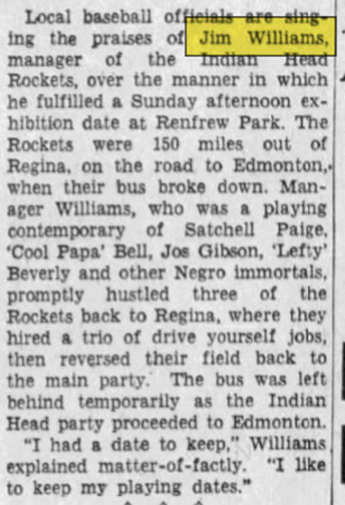 Williams, keeping his feet in both worlds, became the player/manager for the Durham Eagles for a couple of years before moving some of his best players to the Jacksonville Eagles. He seemed to be slipping out of the limelight, but by 1950, a new chapter had arrived- Big Jim in Canada. Far removed from the publicity of the Negro Leagues, his larger-than-life presence would both challenge the patience of league officials and elevate the level of competition, propelling Saskatchewan’s baseball scene to new heights.
