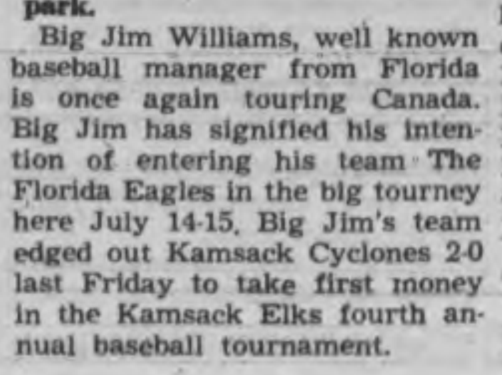 “Aside from the Kamsack tournament mentioned in the clip, the touring Florida Eagles had only a brief stay in Saskatchewan and were known to have played in the Indian Head tournament (a 12 – 4 loss to the Rockets) plus two games in the Shaunavon tourney (a win over Shaunavon and a defeat against the Moose Jaw Lakers). Big Jim even wound up playing a few games for the 1954 Rockets (managed by Gilberto Yzquierdo) late in the campaign when the organization was drowning in debt and had to bring in a few replacement players after the team had released a number of their original team roster.”
