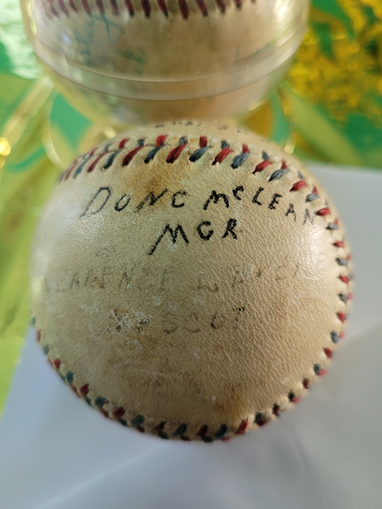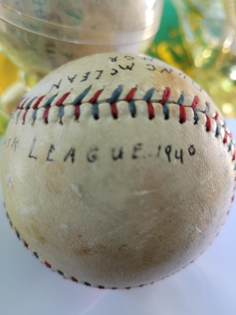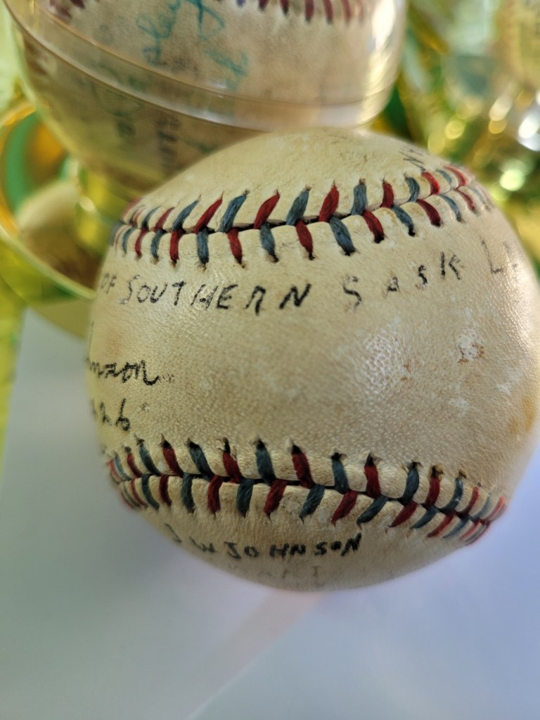 I saw a lot online through our local auction house, and in it, a group of four baseballs. One caught my eye. Just under the double stitches of a yellowed, scuffed “Cork Center Official League Ball” was written Winner of the Southern Sask League 1940. The leather bore printed names in fading ink, some traced over by a surer hand. I could make out “J.W. Johnson” and “From G.W. Johnson PO Box 426, Naple,” (Naple is a town located in Texas) along with “Dunc McLean, MGR.” I didn’t yet know the whole story, but I knew the ball had belonged to someone, and in their hands, it must have been something very special. I bid on it, of course, and won!
