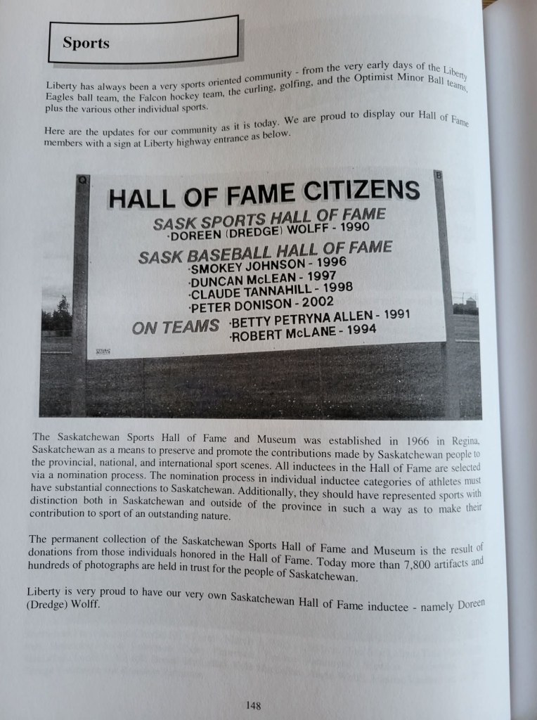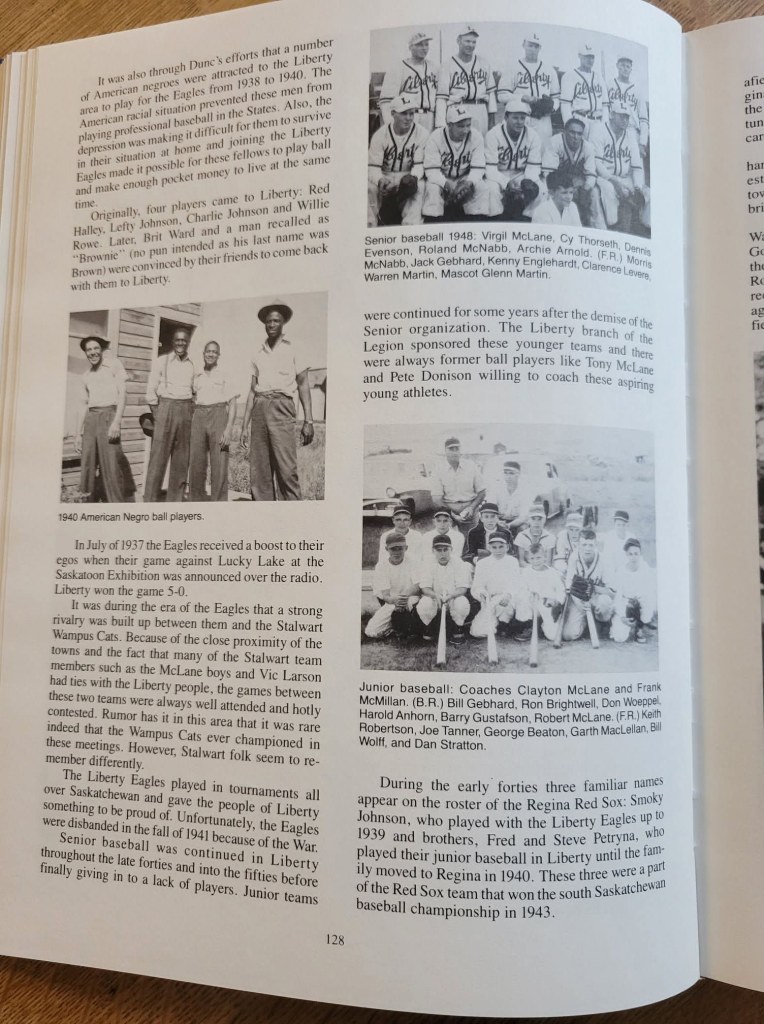 After I posted my article on Historic Saskatchewan, a Facebook page dedicated to sharing local history, Connie & Kelvin Drimmie reached out to me. They provided some additional information from another Liberty history book called “Early Days to Modern Ways”. It included another image of the African American Players as well as a list of Liberty player inductions into the Saskatchewan Sports and Baseball Halls of Fame. Thank you, Connie and Kelvin!