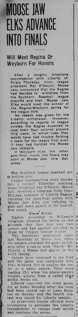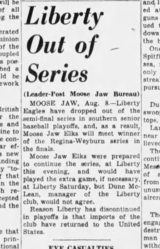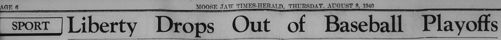 “Liberty Drop Out of Baseball: Moose Jaw Elks Advance Into Finals.” Moose Jaw Times Herald, 8 Aug. 1940, p. 6.