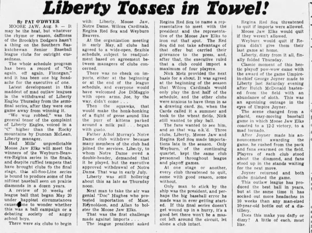 But that freedom came under fire in the summer of 1940. As Leader-Post columnist Pat O’Dywer, who was also president of the SSBL, recounted in his August 9 piece “Liberty Tosses in the Towel,” some clubs began pushing for limits on “imports.” At the time, there were no boundaries, or formal restrictions, on O’Dwyer as league president, to present opinions as a news reporter.
