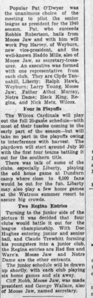 Southern Sask Baseball League UpComing Season Details. The Leader Post, 6 May 1940, p. 16.