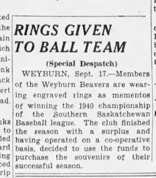“Rings Given to Ball Team.” The Leader Post, 17 Sept. 1940, p. 16.
