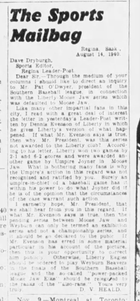 Heald, D. V. “The Sports Mailbag.” The Leader Post, 15 Aug. 1940, p. 13.