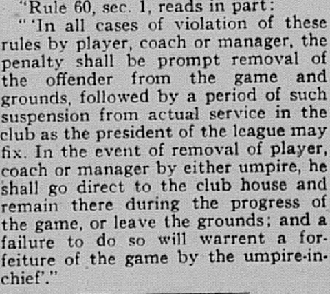 Then came the confrontation. When “Butch” McDonald struck out, his unwillingness to depart from the field quickly, followed by a “lengthy tirade” at plate umpire George Joyner, created an explosion. In an extraordinary move, Joyner awarded the game to Liberty on the spot due to Rule 60, sec. 1: