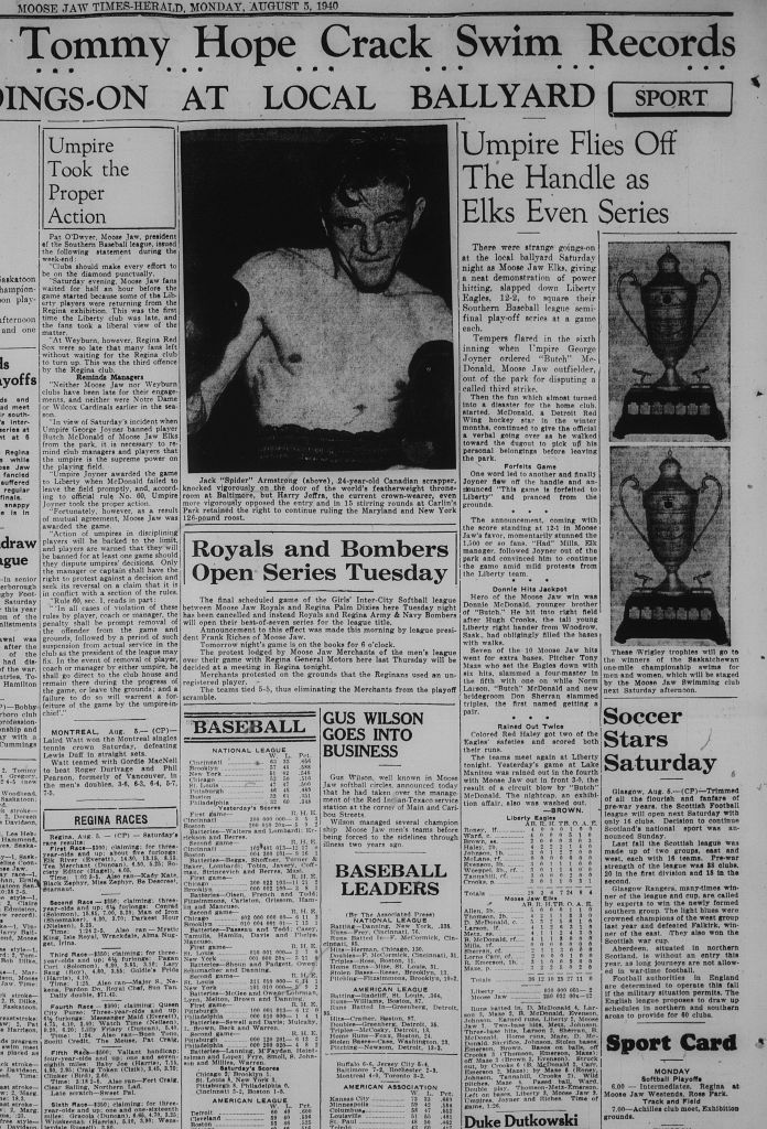 “Umpire Took the Proper Action.” Moose Jaw Times Herald, 5 Aug. 1940.
