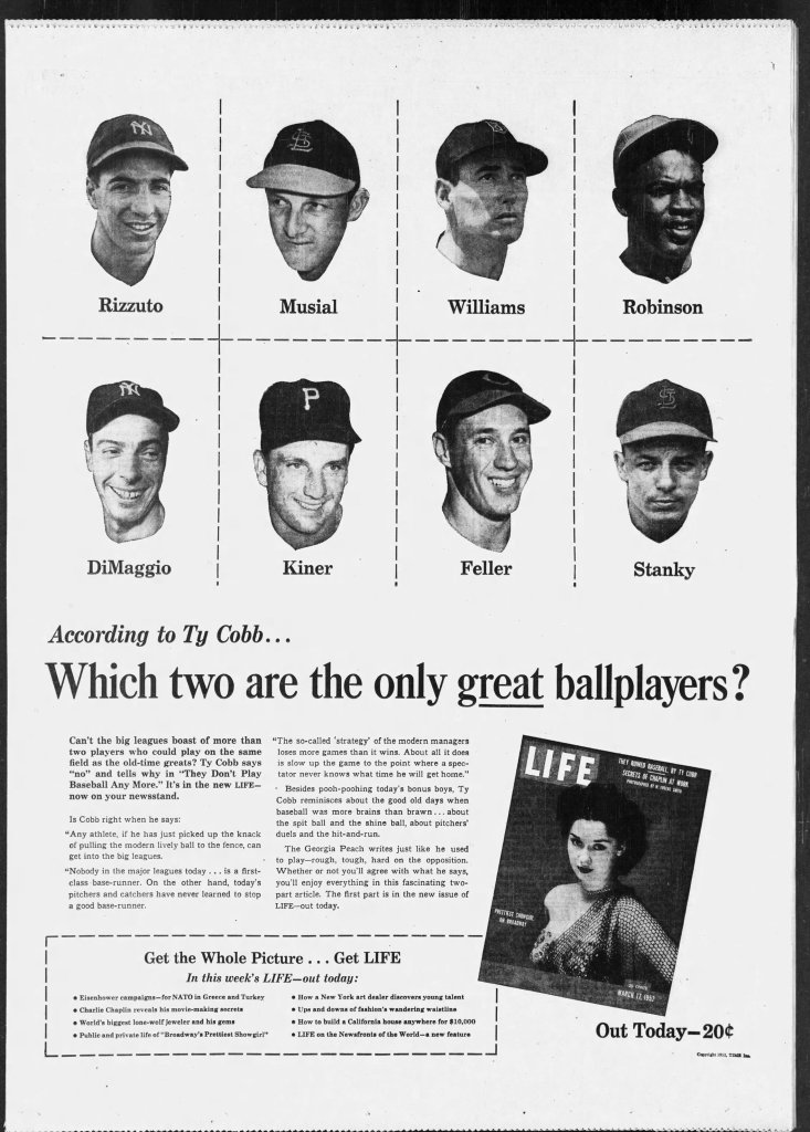 Nearly five decades later, in 1952, the world was once again talking about Ty Cobb—and not kindly. Life magazine had just published his series of articles in which he boldly ranked baseball’s greatest players, beginning with “Who Was the Greatest Player?” where Cobb, never one to shy away from controversy, placed himself above Robinson, DiMaggio, and the rest (The Daily Worker, March 24, 1952, p. 3).