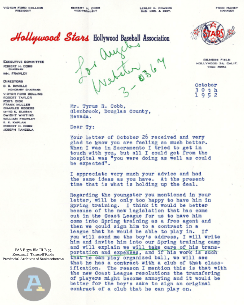 It’s a story about private mentorship and mystery, how baseball’s fiercest competitor may have found something familiar in a young player from the prairies. During the same time, the public saw the most recognized side of Ty Cobb: the volatile figure newspapers called a “dirty player” and “nuts” (The Independent, March 12, 1952, 18). Cobb was indeed a difficult man who once said he had to fight for everything he achieved in baseball. The game had hardened him, building an emotional wall and armour of arrogance around one of its greatest players. Yet in his letters to Koozma Tarasoff, that armour seems to crack. Here, Cobb writes not as the legend or the fighter, but as a man stripped of performance, a mentor revealing a rare vulnerability, wanting only the best for a kid who reminded him what the game once meant.