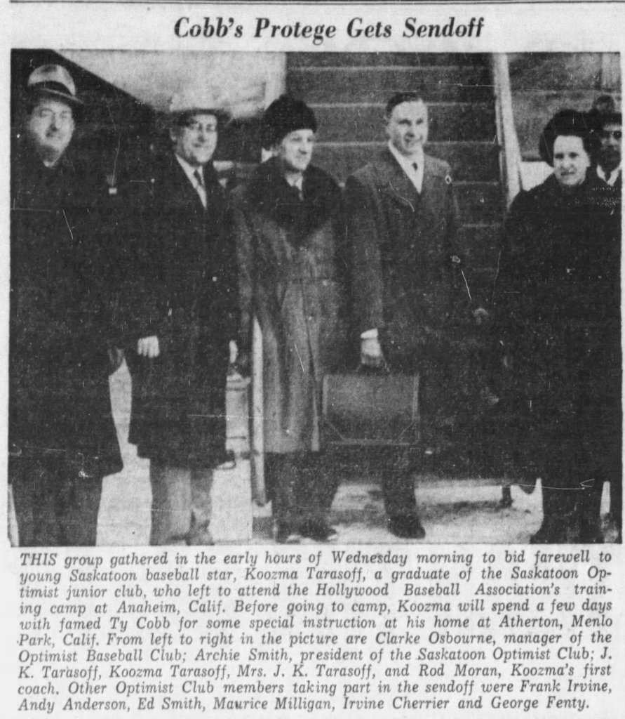 In February 1953, the Saskatoon community gathered at the airport to send off “Cobb’s protégé.” Before reporting to the Hollywood Stars’ spring training camp in Anaheim, Tarasoff was scheduled to spend several days at Ty Cobb’s home in Menlo Park, California, for “special instruction” from the Georgia Peach himself (Star-Phoenix, February 26, 1953, p. 21). That farewell, captured in a photograph of Koozma standing with his parents and local supporters, symbolized the reach of Cobb’s mentorship and the extraordinary journey of a young Saskatchewan boy whose dream had carried him into baseball’s golden age.