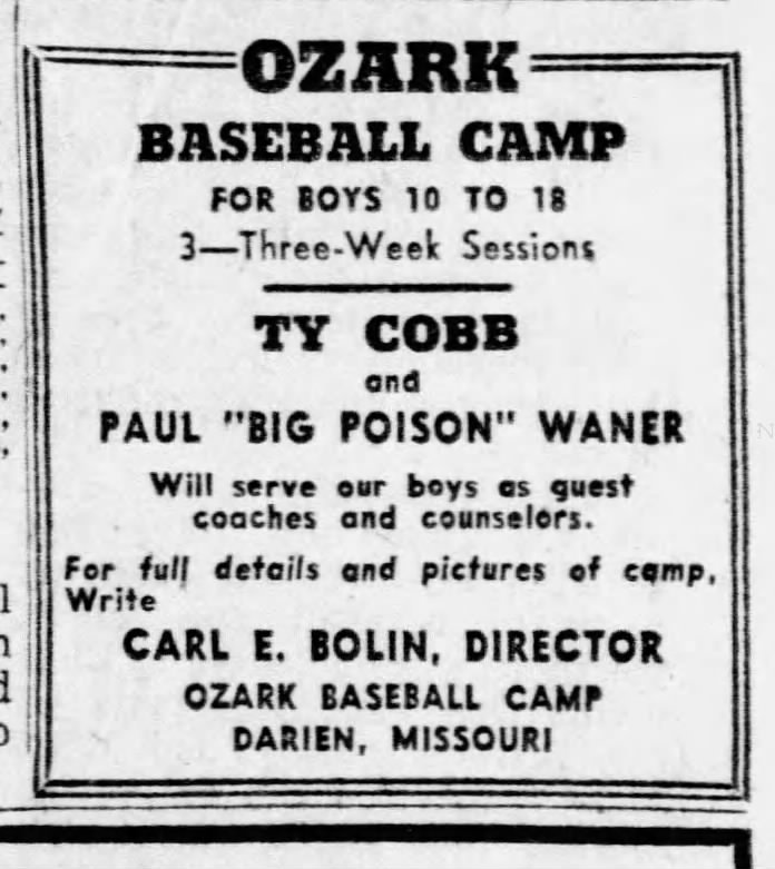 In June 1952, Ty Cobb, now 66, stepped back into baseball —this time not to play, but to teach. He joined director Carl Bolin’s coaching staff, which included former St. Louis Cardinal first baseman Jim Bottomley, Boston Braves pitcher Ben Cantwell, New York Yanks’ twirler Wally Schang, and Pittsburgh moundsman Elmer Jacobs. New to the summer staff were Pirates’ former slugger Paul “Big Poison” Waner and Ty Cobb. The Ozark Baseball Camp, a Missouri summer program for boys eager to learn the game from the greats (Arlington Heights Herald, June 13, 1952, p.20). The St. Louis Post-Dispatch reported that Cobb was still fierce, demonstrating slides, leads, and the art of controlled aggression on the bases (St. Louis Post-Dispatch, June 15, 1952, p. 66).